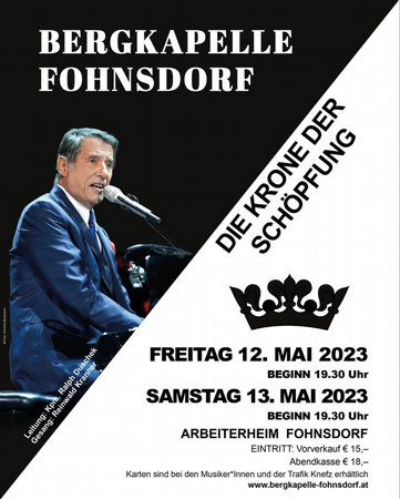 Im Arbeiterheim Fohnsdorf wird die Bergkapelle Fohnsdorf am Freitag, 12. Mai 2023 sowie am Samstag, 13. Mai 2023 jeweils mit Beginn um 19:30 Uhr ihr Frühlingskonzert "Die Krone der Schöpfung" zum Besten geben.