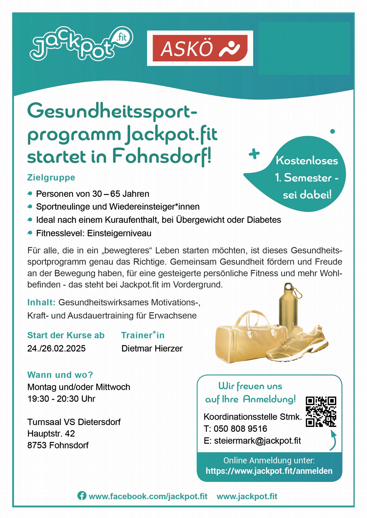 Das Gesundheitsprgramm "Jackpot.fit ist für Personen von 30-65 Jahren, für Sportneulinge und WiedereinsteigerInnen. Ideal nach einem Kuraufenthalt, bei Übergewicht und Diabetes. Einfach für alle, die in ein bewegteres Leben starten wollen.