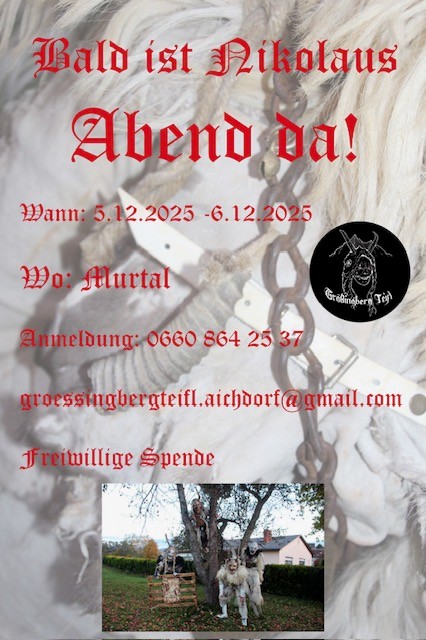 Am 5. und 6. Dezember 2025 sind die Größingberg Teifl wieder überall im Murtal unterwegs. Interessierte können sich unter 0660 / 864 25 37 oder per E-Mail an groessingbergteifl-aichdorf@gmail.com anmelden.